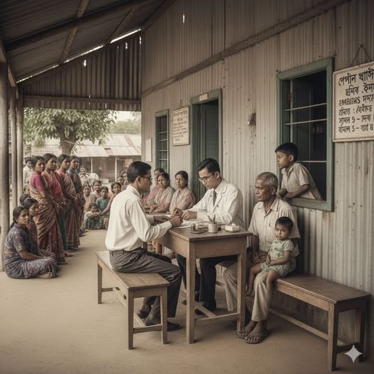 দেখলাম ডোয়াপাকা একটি পুরাতন টিনের ঘর। সামনে বারান্দা। হাসপাতালের সামনে প্রায় একশত জন লোক। একজন উস্কো খুসকো লোক কানে একটা বিড়ি আটকানো, গায়ে রান্নাকরার ছাই লাগানো শার্ট, মাঝে মাঝে বিড়ির আগুনে গোল গোল করে ছিদ্র করে পোড়া, পেছনে লুঙ্গীর কোছে বিড়ির প্যাকেট, আমার দিকে ইঙ্গিত করে জানতে চাইল ‘সাহেব কে?’